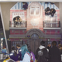展品“镜中奇迹”造型精美,在现象呈现上别出心裁。远远看去,观众仿佛站在一座楼房的阳台上。走近细看,才明白原来是利用了平面镜反射的原理,地面楼房的图案投射到一面巨大倾斜的平面镜中,孩子们在地面上的活动变成了在楼房墙壁上“飞檐走壁”。
