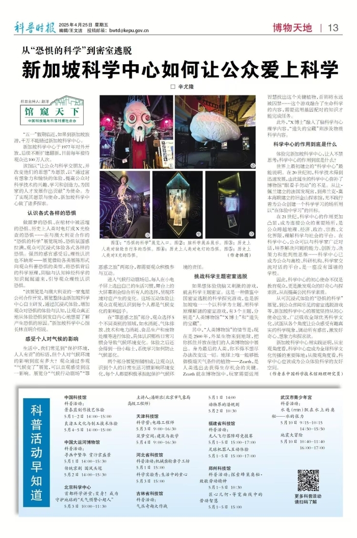 从可沉浸式体验的“恐惧的科学”展览,到公众喜闻乐见的密室逃脱游戏等,新加坡科学中心的展览坚持从初心使命出发,广泛吸收全球优秀科学文化,试图从各个角度让公众感受有趣真实的科学现象,调动所有感官,激发好奇心、想象力和探求欲。