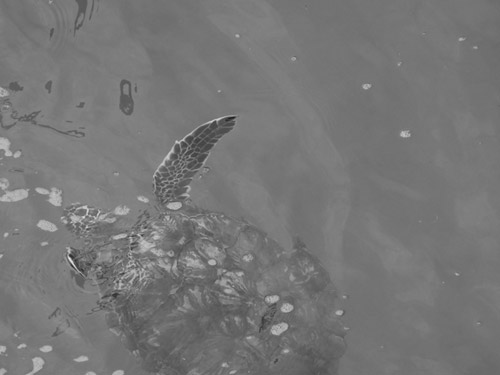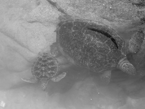 海龟懒懒地在海水中游弋,不慌不忙,不着急争夺食物,也不着急开拓疆土,就那么悠闲地生活着。要知道,智者都是修炼出来的。这位大哥大级的“海物”早在二亿多年前就出现在地球上了,它们曾经和不可一世的恐龙一起散步,是名副其实的“活化石”,自然会有些超然的境界喽。