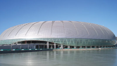 天津奥林匹克中心体育场婀娜地点缀在人工湖间,与临近的水上公园湖面相映,仿佛一颗晶莹的“水滴”。它是由日本株式会社佐藤综合计画和天津市建筑设计院联合设计的天津奥林匹克中心竞技区,充分利用天津市区西南部自然水域丰富的优势,将体育场馆临水而建,依水而起。竞技区内水波荡漾,水流婉转;场馆之间栈桥相通,水脉相连,呈现出“大珠小珠落玉盘”般的诗意画卷。观众可以在观赏精彩赛事之余,穿越“湖光漫步廊”,欣赏由8万平方米水面和8.7万平方米绿地组成的秀美景色。它整体上突出了“绿色奥运”、“科技奥运”和“人文奥运”三大理念。整个中心体育场占地7.8万平方米,建筑面积15.8万平方米,该体育场南北长380米,东西长270米,高53米,设计分为六层。 既可满足国际足球和田径比赛要求,又设有卖场、展馆、会议厅、健身室等多项辅助设施,是融群众休闲、娱乐、健身、购物为一体的综合性体育场。