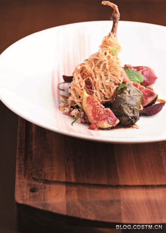 5. 无花果切瓣,置入摆盘中,在乳鸽上淋无花果汁即可。