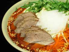 面对食材相对匮乏的窘境,西北地区以面为基础,花样翻新,让本来贫乏的味道具备了别样滋味。兰州牛肉拉面创始于清光绪年间,系回族老人马保子首创,拉面以肉烂汤鲜、面质精细而蜚声中外,讲究一清(汤清)、二白(萝卜白)、三红(辣子油红)、四绿(香菜绿)、五黄(面条黄亮)。面条根据粗细可分为大宽、宽、细、二细、毛细、韭叶子等种类。面条手工现场拉制而成,一碗面不到两分钟即可做好,再浇上调好的牛肉汤、白萝卜片,调上红红的辣椒油、碧绿的蒜苗、香菜,食之令人叫绝。