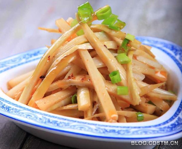 1. 春笋洗净后切成细丝,下锅焯水,捞出沥干水分。