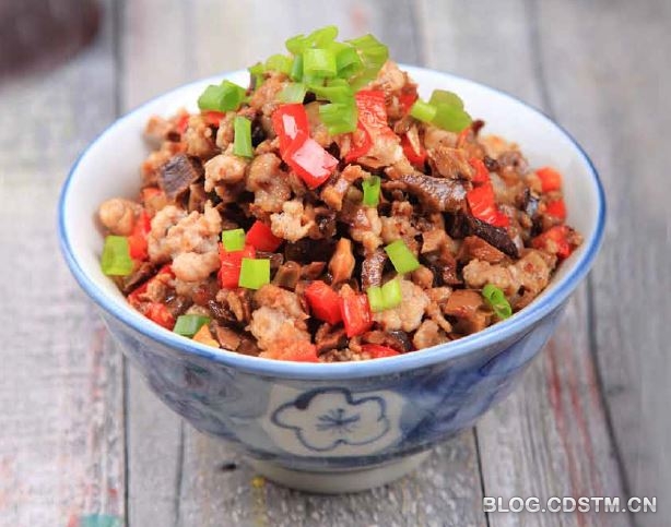 3. 锅加热,倒入橄榄油,下肉馅炒散后,倒入笋干碎翻炒,起锅前下入辣椒丁、食盐,翻炒均匀后起锅装盘。