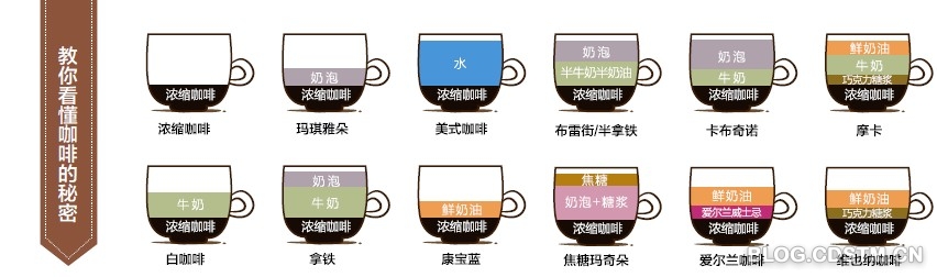 过去对咖啡知之甚少,至多也就是喝过几款品牌的速溶咖啡,所以看到咖啡店里卡布奇诺、摩卡、美式、玛奇朵、爱尔兰几十甚至上百个品种,就自以为是地认为,跟中国的茶一样,这些不同的咖啡都是用不同品种的咖啡豆冲泡的。后来,有了点浅显的了解后才知道,如此多的种类可以说跟咖啡本身没有太大关系,同一种咖啡经过烘焙、研磨、煮泡、过滤、浓缩等工序后,再由咖啡师加入不同比例的牛奶、焦糖、奶油、巧克力糖浆以及其他一些配料,就调配出了风味各异的各式咖啡。说起来好像很复杂,其实不然,一张图就教你看懂咖啡的秘密。