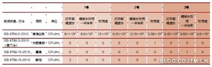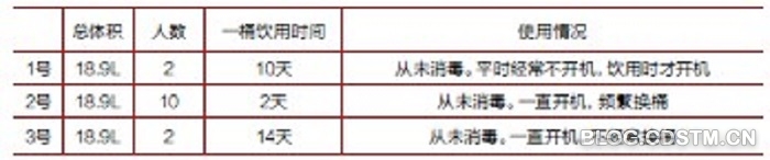 本次检测是针对有关单位3台饮水机的抽样检测,3台饮水机投入使用后从未消毒过。在一桶饮用水饮用初期、饮用一半、饮用结束3个不同阶段抽取水样,共抽取的9个样本的菌落总数均超过国家标准。3台饮水机的使用状况不同(一桶水饮用时间不同),样本的菌落总数也不相同。其中不经常使用或长时间未使用完的水样菌落总数是经常使用状况下的2~50倍。
