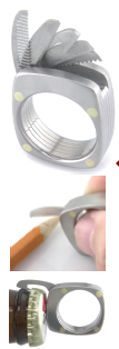 这是一款由Bruce Boone设计的堪比瑞士军刀的戒指。它的材料是航空级钛金属,虽然戒指厚度只有9 mm, 但它却深藏不露,包含了开瓶器、直片刀、锯木锯齿刀、尼龙布锯齿刀和一把梳子。在外出露营时,仅仅这一枚戒指就可以满足你切割包装胶带或钓鱼线,锯开塑料或木材的需求,甚至连梳头发都考虑到了。所有的工具由黄铜铆钉固定板连接在一起,精准并轻巧舒适。戒指是定制的,每一枚都会刻上属于你的唯一编号,注入如此多功能的首饰使生活更加便捷。