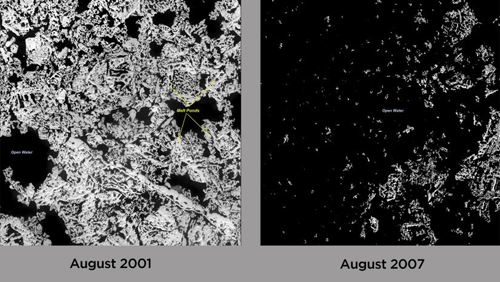 《地球物理研究快报》公布的一项研究报告说,由于北冰洋继续以惊人的速度失去海冰,因此该地区渐趋活跃。这个世界上曾经最安静的海洋已经开始搅动,比以前热闹和混乱得多。科学家们担心,海洋运动中的这些变化会加速北极海冰的融化。例如在2007年夏季的两周内,北极海冰每天减少81081平方英里。