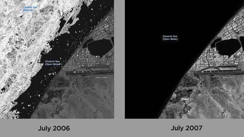 阿拉斯加的巴罗镇位于波弗特海海岸。在冬季沿海通常都会结冰,到7月中旬海冰融化或破裂。卫星图像显示,随着时间的推移,该地区的海冰融化显着增加。