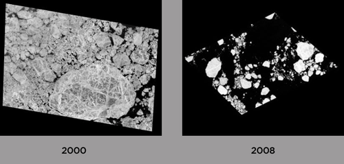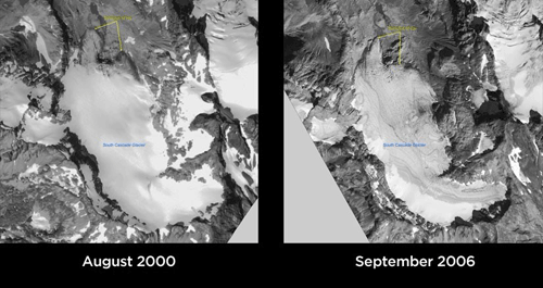 这两幅是美国华盛顿州南喀斯喀特山脉冰川的图像,表明它从2000年至2006年正在不停地后移,这种迅速融化可能威胁到低洼的沿海城镇和社区。