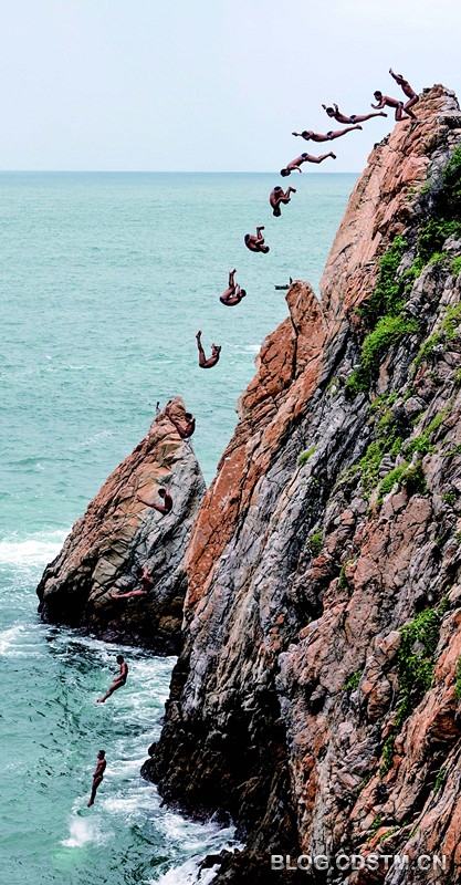 这张图片展示了世界上最为著名的阿卡普尔科悬崖跳水。阿卡普尔科的悬崖跳水开始于1934 年,当初作为一项冒险活动,后来逐步成为旅游服务项目。跳水者起跳前要把握住海浪的走向、潮水和风力,抓住适当时机下跳,实际接触到水面的时间只有3秒钟。跳水表演者中不少人来自跳水世家,年龄最小的还不到10 岁。本图为跳水动作分解电脑合成图