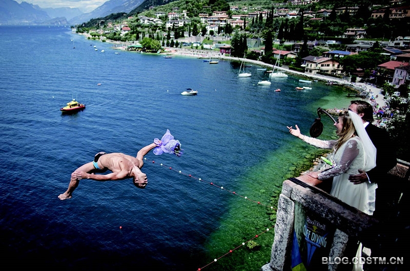红牛悬崖跳水系列赛意大利站,选手麦克在纵身跃下的过程中接住一对新郎新娘从24 米高的阳台上抛下的花束,令人叫绝!