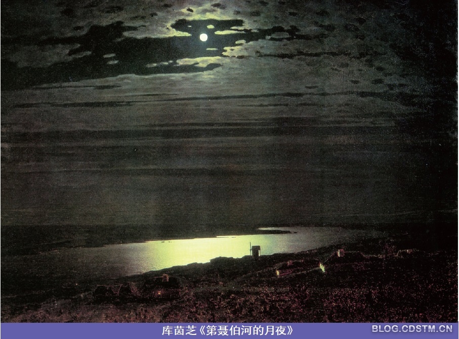 乌克兰风景画家库茵芝的杰作《第聂伯河的月夜》展现了第聂伯河的月夜流光溢彩的奇妙景观,曾被俄罗斯大画家列宾赞为“触动观众心灵的诗”。画中明月当空,观者只要细看,可以观察到在月亮与夜空交界的地方有两条清晰的马赫带圆环(即亮环和暗环),使皓月从灰色的天穹背景中凸显出来,分外皎洁。特别是明朗的亮环,反而让月体内部显得有点朦胧,给观者对有关月亮的传说产生无限的遐想。围绕着月亮周围的彩云是由灰色的天穹背景映衬出来的,同样的方法也营造出第聂伯河水波涟漪、浮光跃银的美景。整幅画洋溢着一种渺茫、旷远和宁静的气氛,让人想起旋律优美的贝多芬的《月光奏鸣曲》。1880年此画在圣彼得堡展出时引起轰动,观众如潮,一时传为美谈。