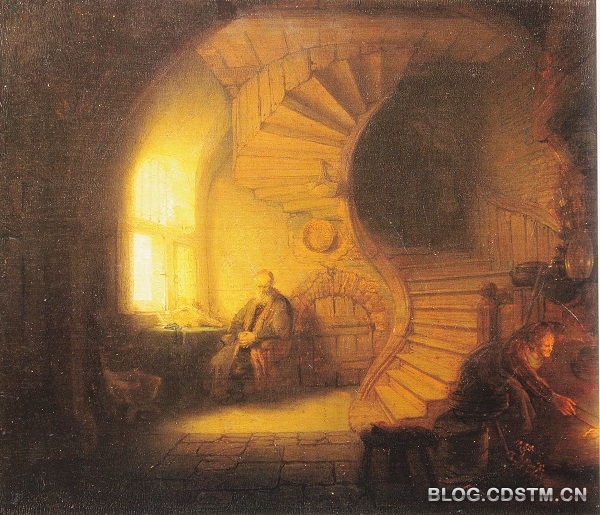 《哲学家》是一幅很能说明问题的作品。在一间高大但十分阴暗的房舍内,年老的哲学家坐在宽敞的窗前,阳光透过玻璃窗照射到室内,照亮了书桌和老人,并在墙壁和地板上留下了巨大的阴影。请注意,哲学家的额头上有一小点亮斑,象征着他思维的光芒,而在窗框上可以看到条状的阴影。科学家用光度计测量可知,条状阴影的实际亮度要比哲学家额头上的光斑还要亮一些,但是看起来的却一处是阴影,一处是亮斑,那就是它们与周边环境的亮度比较后产生的视觉感受。在这幅画中伦勃朗巧妙地采用了背景亮度的变化,衬托出了哲学家的额头。为了做到这一点,他对真实场景的照明做了修正,画中窗口的亮度比房间的左下角仅仅亮了15倍,如果在真实的情况里,两者的亮度之比也许要超过100倍。