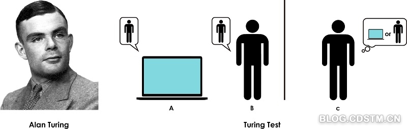 美国科学家图灵于1950年在英国《心》(Mind)杂志上发表了《计算机和智能》一文。文中预言了创造出具有真正智能的机器的可能性。由于注意到“智能”这一概念难以确切定义,他提出了著名的图灵测试:如果一台机器能够与人类展开对话(通过电传设备)而不能被辨别出其机器身份,那么称这台机器具有智能。后人称之为“图灵测试”。