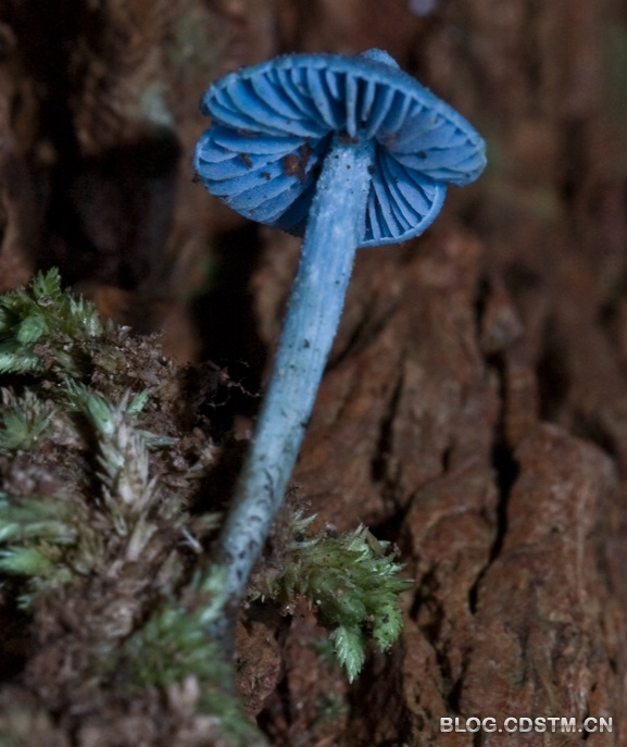 天蓝蘑菇(Entoloma hochstetteri),伞菌科蘑菇属菌类,天蓝蘑菇是在新西兰和印度发现的一个菌种。这个小小的蘑菇通体都是蓝莹莹的,只有菌褶部分可以看到红色孢子的痕迹。