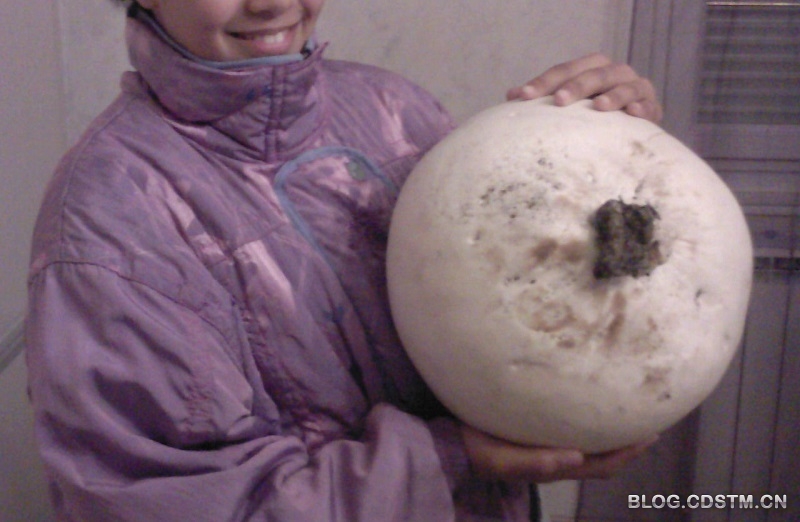 巨形秃马勃菌(Calvatia gigantea),看上去像个白色的大面团,单生或群生于草地。通常有足球大小,直径15~25厘米或更大。成熟的马勃菌轻轻一碰就会爆炸,孢子像尘暴那样扩散出来。