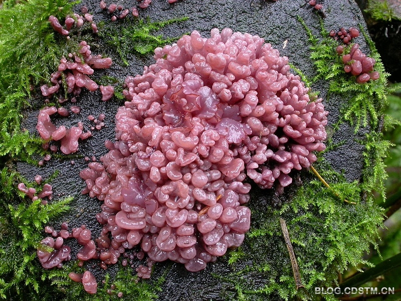 这种果冻状的菌类学名肉质囊盘菌 (Ascocoryne Sarcoides),最早在一颗落叶木桩上发现的。随着水分和养料的摄入,此菌会从幼年耳垂状生长出紧密排列的绳结状。此菌主要分布在英国、澳大利亚等地。