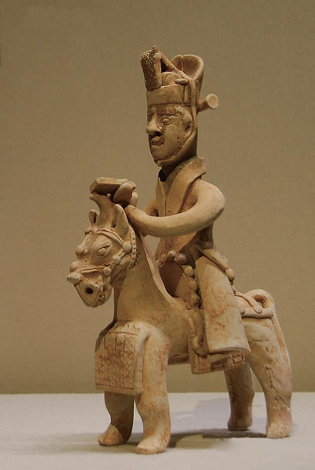 中国目前发现的马镫资料,有形象和实物两种。其中,形象的资料以湖南长沙出土的西晋永宁二年(公元302年)墓的骑马俑为代表(图1)。该俑在马鞍左侧前部靠近鞍桥之处,悬挂着三角形的马镫。有趣的是,考古学者还发现,该俑上只有左侧一个马镫,右侧却没有另一个马镫,并且骑马人的脚也不放到马镫里。研究者认为,单镫是仅供上下马时方便之用的(图2),而非骑马时双脚踏足之用的,属于马镫发明初期的一种原始形态和用法,最早出现在中原或长江下游地区,时间上甚至可以早到东汉。
