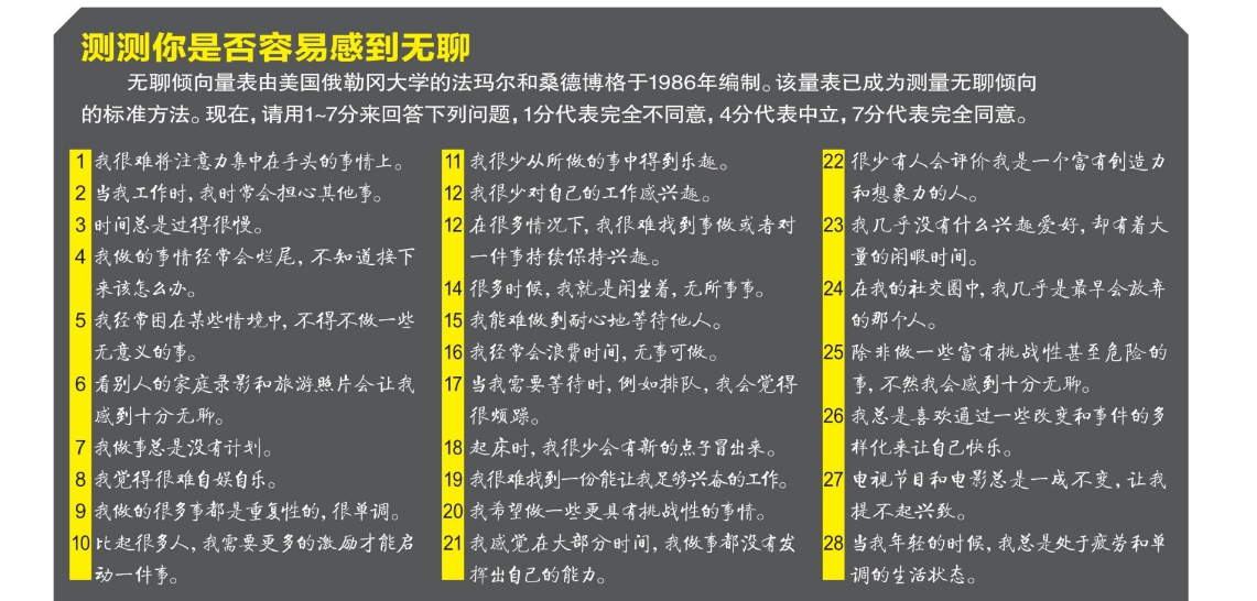 有人说,只有无趣的人才会感到无聊。这种说法当然是不公平的,但的确有些人比其他人更容易感到无聊。测试一个人是否容易感到无聊的标准方式是填写无聊倾向量表(BPS)。该量表最早于1986年由美国俄勒冈大学的法玛尔和桑德博格提出。