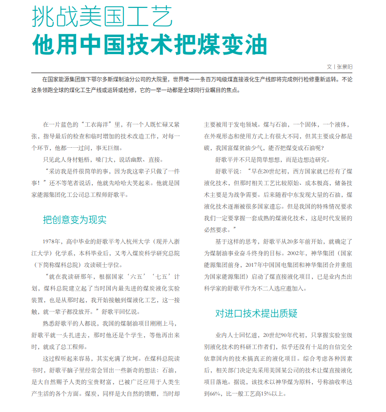 挑战美国工艺 他用中国技术把煤变油