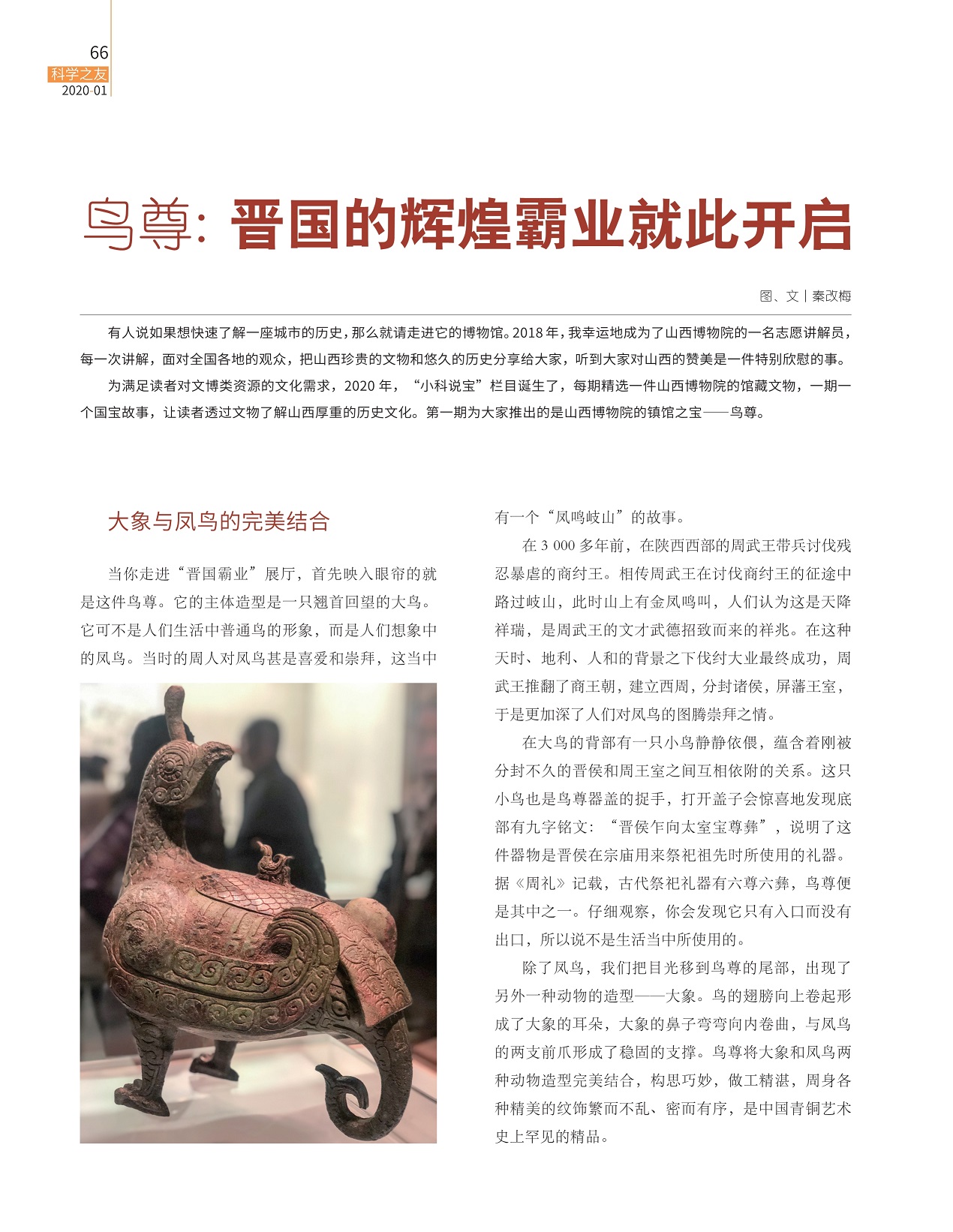 当你走进“晋国霸业”展厅,首先映入眼帘的就是这件鸟尊。它的主体造型是一只翘首回望的大鸟。它可不是人们生活中普通鸟的形象,而是人们想象中的凤鸟。