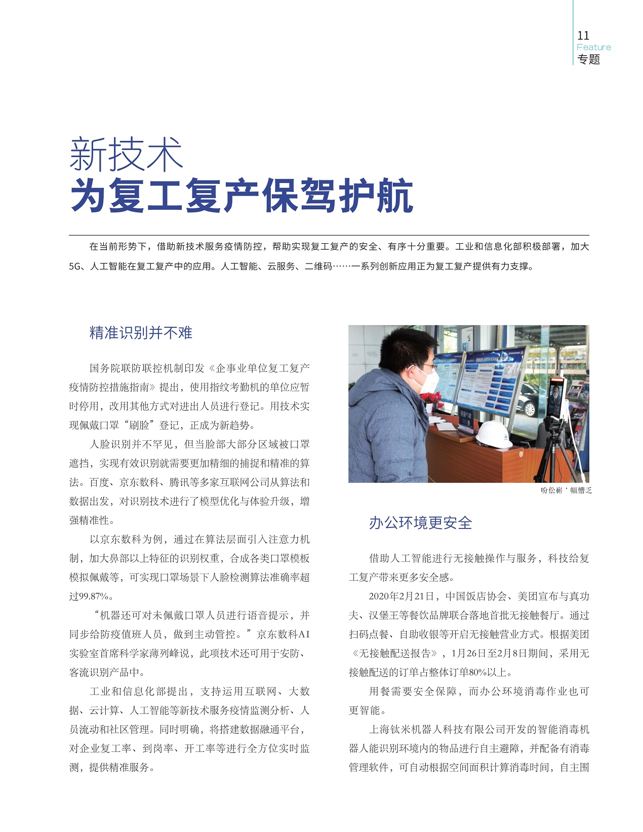 在当前形势下,借助新技术服务疫情防控,帮助实现复工复产的安全、有序十分重要。工业和信息化部积极部署,加大5G、人工智能在复工复产中的应用。