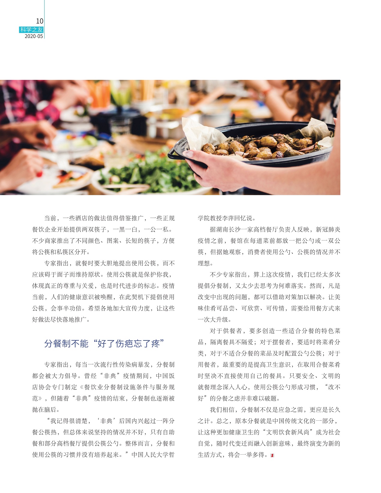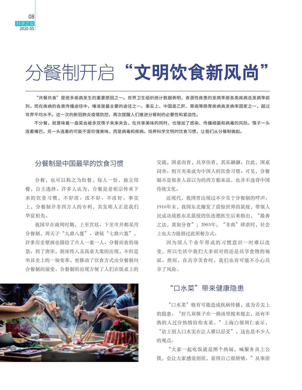 新冠肺炎疫情期间,全国发生多起因家庭聚集或外出聚餐造成感染的典型案例让人们意识到,习以为常的“共餐共食”会为病毒传播创造机会,倡导推广分餐制再次进入公众视野。