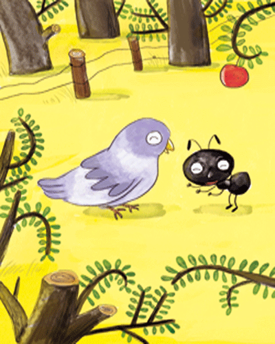 蚂蚁和鸽子都救了对方一命,它们非常开心,牵着对方的手说:“We are friends!”