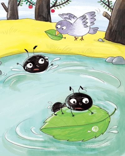 小鸽子从远处叼来一片树叶:“Here you are!”小蚂蚁爬上了树叶,把树叶当做小船,划到了对岸。
