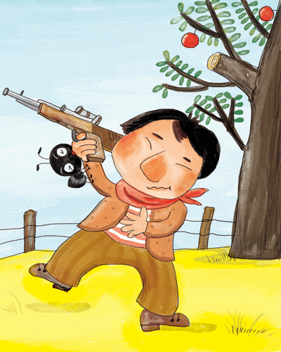 这时,蚂蚁看到有个猎人用枪口对准了鸽子!它高呼着:“Look out! The gun!”