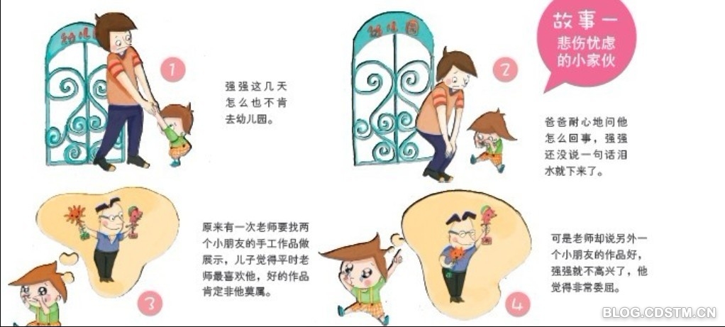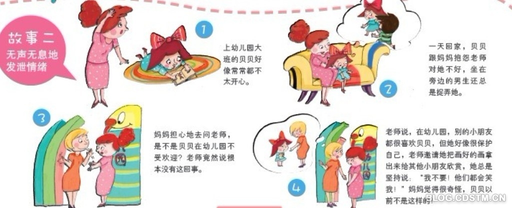 怎么回事,强强还没说一句话泪水就下来了。原来有一次老师要找两个小朋友的手工作品做展示,儿子觉得平时老师最喜欢他,好的作品肯定非他莫属。可是老师却说另外一个小朋友的作品好,强强就不高兴了,他觉得非常委屈。故事二 无声无息地发泄情绪