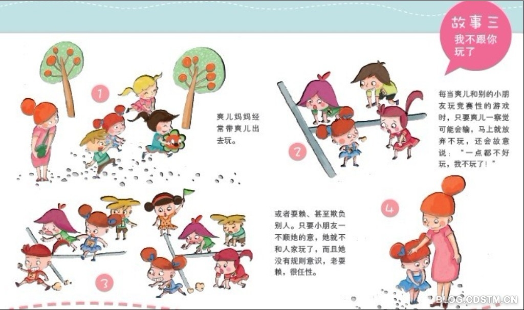 友玩竞赛性的游戏时,只要爽儿一察觉可能会输,马上就放弃不玩, 还会故意说: “ 一点都不好玩,我不玩了!”或者耍赖、甚至欺负别人。只要小朋友一不顺她的意,她就不和人家玩了,而且她没有规则意识,老耍赖,很任性。故事四 奶奶家是最好的避风港
