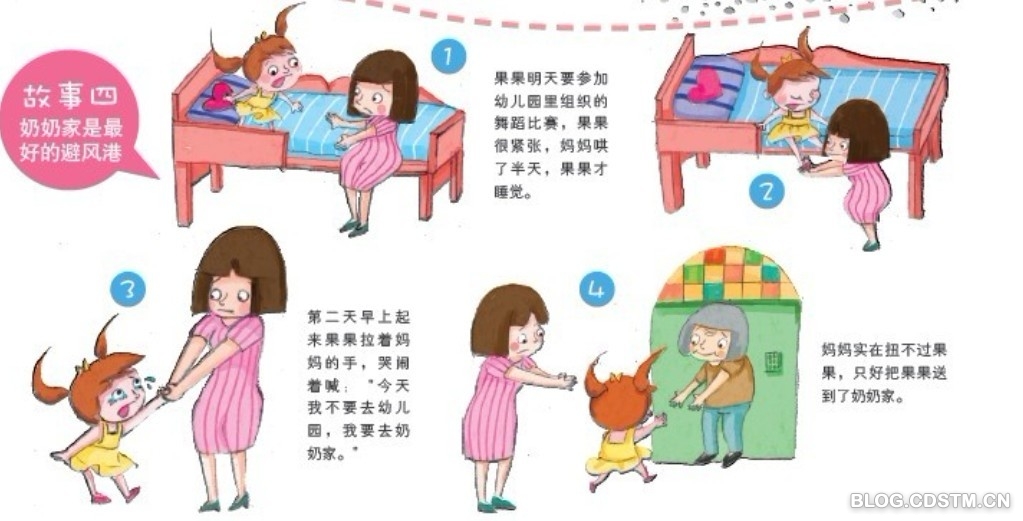来果果拉着妈妈的手, 哭闹着喊: “ 今天我不要去幼儿园, 我要去奶奶家。”妈妈实在扭不过果果,只好把果果送到了奶奶家。专家指导