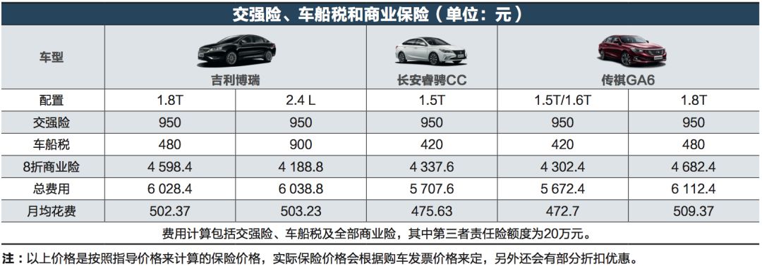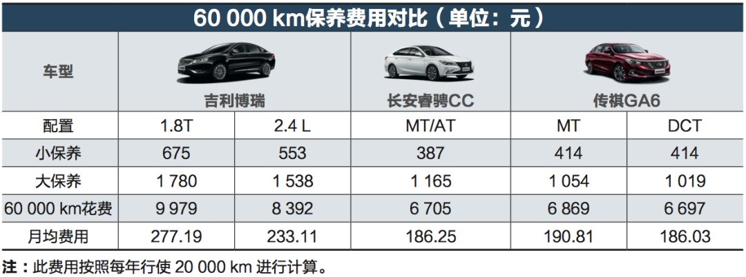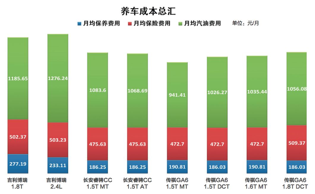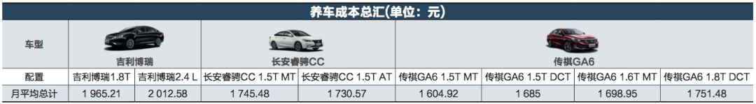 吉利博瑞虽然是三款车型中养车成本最高的,但介于本身的车型定位就要高于其余两款车型,所以更高的养车成本也可以理解,而且吉利博瑞的口碑是三款车型中最好的,这也可以弥补一些养成本高的缺点。而长安睿骋CC虽然是三款车型中售价最低的,而且做工和驾驶感受都算不错。所以也有一定的竞争力,而传祺GA6虽然养车成本较有优势,但整体的车型口碑都不如其余两款车,所以在竞争力上还是要稍逊于另外两款车。