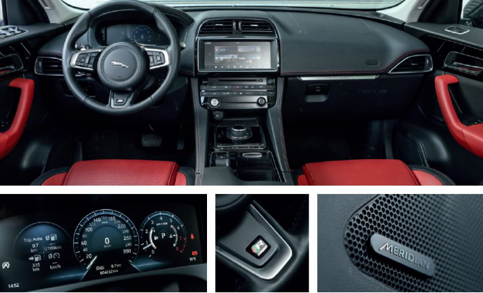 捷豹F-PACE 的内饰设计与XEL 基本上是完全相同的,多功能方向盘的样式、中控台样式和按键布局几乎完全相同,除了能从坐姿感受到轿车与SUV 的区别之外,在视觉效果上和XEL 没什么两样。个人感觉这种低差别的设计在降低设计和制造成本方面的目的太过明显,不过从视觉效果来说并没有什么不足或是过分的另类和个性,而且内饰风格与外观设计风格也是比较统一的。