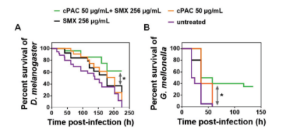 ▲昆虫模型中显示原花青素与抗生素的体内协同抗菌作用
