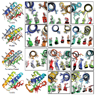 贝克团队瓦解了这道横亘在生物学与蛋白质结构之间的艰难壁垒,重新研究Foldit并对其添加了新的设计规则。首先,Foldit玩家需在设计的结果中设定疏水残基的最小百分比(比如30%)。其次,Foldit玩家需在二级结构序列中剔除甘氨酸和丙氨酸,尽量减少α-螺旋的形成。最后,Foldit玩家需在设计的结构中排除分子内相互作用不足的大的氨基酸残基。将这些规则添加到Foldit之后,Foldit玩家获得的高分蛋白都是紧密且稳定的球状蛋白质。此外,在自定义合成的基因编码设计中,有12个蛋白质的结构预测均在Foldit玩家的设计构象之中,且与任何已知的蛋白质没有同源性。贝克团队在大肠杆菌中表达这些蛋白质,并通过金属亲和层析和分子筛色谱法纯化。经圆二色光谱分析表明,12个蛋白质中有6个是单体且折叠在溶液中。此外,贝克团队还成功地获得了Foldit玩家设计的4个高分辨率晶体结构。其中,3个X射线晶体结构蛋白质与设计的构造紧密匹配。