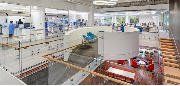 美国基础医学公司在基因组技术和癌症生物学领域处于创新领袖地位,提供癌症治疗优化分析。实验室设计使用开放工作环境,在保证安全性、功能性和灵活性的同时强调建筑美感。玻璃隔断和多种会议空间供参观和访问交流。