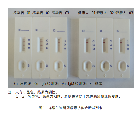 针对这一研发目标,祥耀生物公司团队在获取新冠病毒序列后,立即联络多方资源,利用自有的蛋白表达平台,制备了病毒的N蛋白、S蛋白、S蛋白的受体结合域(receptor binding domain,RBD)蛋白等核心原料,研发出快速检测试剂盒,委托有生产资质的诊断试剂生产企业生产,并交付定点医院进行血清阴性检出率及阳性检出率的临床测试。为了得到特异性更强、准确度更高的胶体金检测试纸条,团队同时对S蛋白和N蛋白进行序列分析,合成并筛选出多个新冠病毒的优势抗原表位肽,并基于抗原表位肽开发出了灵敏度高、一致性好的IgM/IgG抗体诊断试剂盒。该试剂盒操作便捷,仅需采一滴血,10分钟即可肉眼获知检测结果(见图1),大大缩短了检测时间。目前临床数据显示,祥耀生物公司的新冠病毒抗体快检试剂盒与核酸检测试剂盒相比,阳性检出的一致性为95%,该产品目前已通过欧盟CE认证。