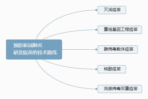 疫苗是将病原体及其代谢物经过人工减毒、灭活或利用基因工程等方法制成的用于预防传染病的免疫制剂。疫苗保留了病原菌刺激动物体免疫系统的特性。接种疫苗后,当机体再次接触到这种病原时,免疫系统便会识别并阻止病原菌的伤害,其核心是通过诱导产生特异抗体。疫苗的产生是人类历史上一件具有里程碑意义的事件。控制传染性疾病最主要的手段就是预防,而接种疫苗被认为是最行之有效的措施。因此,预防新冠肺炎最重要的手段就是研发疫苗。目前,国内主要基于5条技术路线研发疫苗:一是灭活疫苗,将新冠病毒进行灭活,经过安全性、有效性评价以后可用于临床试验;二是重组基因工程疫苗,通过基因工程大量生产新冠病毒刺突糖蛋白,并将其注射到人体以产生抗体;三是腺病毒载体疫苗,用腺病毒作为载体,表达新冠病毒刺突糖蛋白,重组的腺病毒感染呼吸道,刺激人体产生抗体;四是核酸疫苗,包括mRNA疫苗和DNA疫苗,用纳米颗粒等材料包裹核酸,注射到人体内,可以表达出新冠病毒蛋白刺激人体产生抗体,抵抗新冠病毒感染;五是流感病毒双重疫苗,以国内上市减毒流感病毒疫苗为载体,携带新冠病毒刺突糖蛋白,既可以预防新冠病毒,又可以预防流感,具有深远的临床意义。
