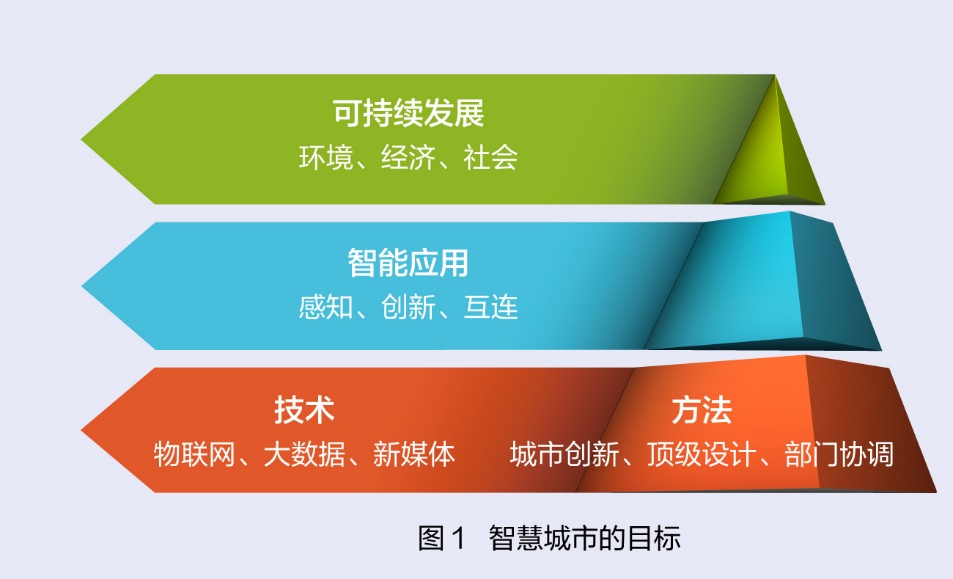 地理空间技术、物联网、互联网+、移动技术、大数据等能够为智慧城市的建设提供很好的技术支撑。用先进技术解决复杂的城市问题,实现城市和谐发展、城市宜居、城市高效运行、城市生态环境保护,建设一个可持续发展的城市,这正是发展智慧城市的目标(见图1)。