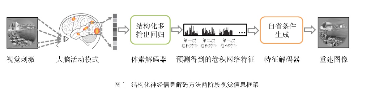 实际上,在大规模图像数据集上预训练的卷积神经网络的层次视觉特征已经在神经解码领域中被用来近似代替人类视觉系统的神经表征。2017年,美国普渡大学的研究人员利用卷积神经网络重建被试者在功能磁共振扫描仪中观看的电影片段,而不必将解码后的活动模式与之前生成的其他活动模式进行比较。2018年,日本京都大学的研究人员使用了预训练的卷积神经网络来解码和重建看到的、想象的视觉图像的神经活动。同年,我们研究团队提出了一种基于贝叶斯深度学习的视觉神经信息解码方法,能够根据记录到的脑活动信号重建被试者所感知到的视觉刺激内容,如手写数字、字母等图案。2020年,针对复杂自然视觉刺激的神经信息解码问题,我们团队又提出了一种结构化神经信息解码方法(如图1所示)。该方法包括两个级联阶段:在第一阶段,我们构建了一个同时考虑输入体素、解码任务和输出节点之间的协方差结构的结构化多输出回归模型;在第二阶段,我们开发了一种自省条件生成模型,这种模型可以很容易地被训练,用于生成高质量的重建图像。通过结构化神经信息解码方法,我们可以揭示多个典型计算机视觉模型与人脑腹侧视觉通路在层次化特征表达方面的联系。基于上述联系,我们可以清晰地重建出被试者所感知到的复杂自然图像和人脸刺激内容。