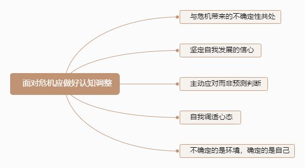 我们在讨论认知能力时,其实就是在讨论获得知识和应用知识的过程。也就是说,当外部信息输送给你时,你如何处理、利用它,该如何转换它,最后又该如何做出你的选择,这就是认知。在认知当中有一个很重要的训练,就是认知危机的能力。这既是管理者的心理基础,也是整个组织的心理基础。在危机当中,我们要做好以下几个方面的认知调整。