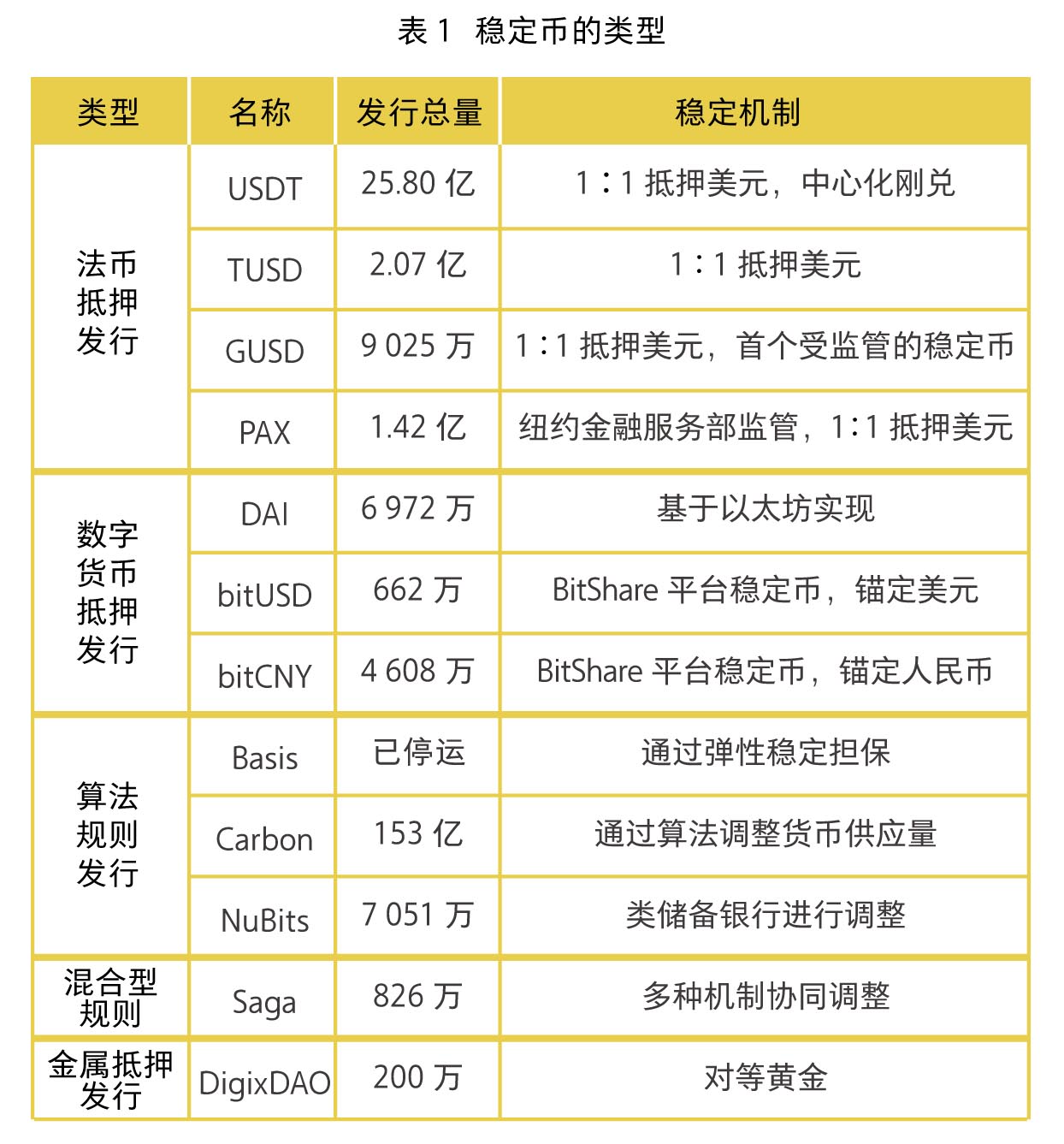近年来,以比特币、以太坊等为代表的数字货币在全球引起广泛关注,且逐渐形成多个具有实际落地应用的生态圈。但是,数字经济体中通证的价格波动过于剧烈,导致各类支付和流通面临困境。因此,具有相对稳定的价格水平、能抵抗通货膨胀和市场环境的稳定币概念被提出,并从多个角度被不断尝试。稳定币的类型见表1。