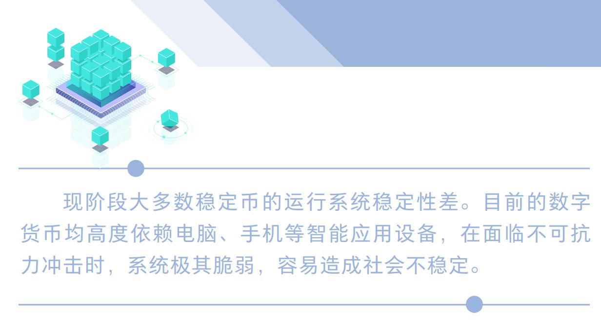 然而,现阶段大多数稳定币的运行系统稳定性差。目前的数字货币均高度依赖电脑、手机等智能应用设备,在面临不可抗力冲击时,系统极其脆弱,容易造成社会不稳定。2018年4月,有望成为全球第一个无现金社会的瑞典,其中央银行在发布的报告中称,完全的无现金社会容易遭受黑客、战争和自然灾害等的冲击。瑞典中央银行还呼吁立法机构通过法律要求银行提供基本的账户服务,包括现金服务,因为不是每个人都有银行账户、银行卡、智能手机等电子设备,不能强迫社会大众必须要使用这些工具。此外,瑞典中央银行行长也表示,在没有电力的情况下,还需要现金维持正常运转。