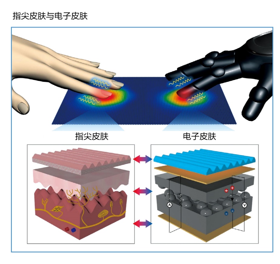 人的皮肤不仅可以感知压力,也可以感知温度和湿度。为了得到对温度和湿度高度敏感的人工皮肤,以色列理工学院的霍萨姆?赫科(Hossam Haick)带领的研究团队将直径为5~8纳米的金纳米粒子置于由柔性聚对苯二甲酸乙二醇酯(PET)制成的基座顶部,得到了一种导电能力随温度、湿度变化而变化的传感器。这种传感器能够在低电压状态下运行,从而满足便携需求。这种检测温度、湿度的传感器未来可以应用到机器人的电子皮肤中。外科医生或许能够利用它来帮助患者恢复知觉。