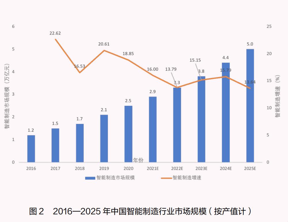 工业是实体经济的重要主体,智能化、数字化转型迫在眉睫,所以我国工业领域的AI应用价值潜力较大。《智能制造发展规划(2016—2020年)》文件的落实有力推进中国工业与新一代信息技术融合发展,加速人工智能技术应用落地。前瞻产业研究院的数据显示,2020年我国智能制造市场规模达到2.5万亿元,至2025年行业市场规模预计达5万亿元(见图2)。另外,工业是一国经济增长的重要驱动力之一,但由于工业领域属于典型的劳动密集型行业,随着人力成本的不断提高,行业的发展必然受到限制。AI可以释放各环节的劳动力成本压力,并且可以提高工业生产效率。