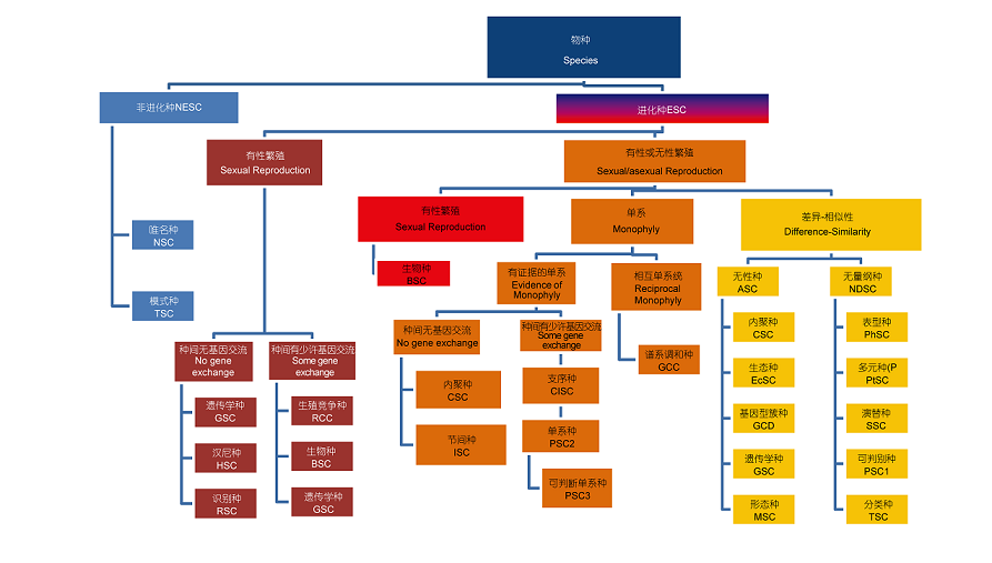 生物分类的意见分歧来源于种的概念。生物以种存在。种是生命科学的基石,是生物多样性的基本单位,是生物分类的基本阶元,是一个可以随时间而变化的个体集合,是真实的存在,是生物进化的基本单元, 是生态系统的基本功能单元。然而,从柏拉图和亚里士多德的模式种概念、达尔文的唯名论种概念(达尔文说“物种这个名词, 我认为完全是为了方便起见, 任意用来表示一群相互密切类似的个体的”), 到群体种概念(生物种是一些具有形态和遗传相似性的种群组成,种内个体的相似性大于种间个体的相似性)。表型种概念(生物种是表型上能识别的生物个体的集合)、生态种概念(物种是生态系统的功能单元,每个物种占据一个生态位)、时间种概念(当一个物种的后代随着时间的演化,其表型的差异足以区别与其祖先区别时,一个新的时间种即形成了)、分支种概念(以生物进化每个分支事件,即两个线系的衍征产生,作为物种的识别标准),物种的概念也在演化。Maydan总结了25种进化种概念,发现这些概念之间有交叉、甚至有包含关系。笔者综合唯名种、模式种和Maydan总结的进化种概念绘制了图1.