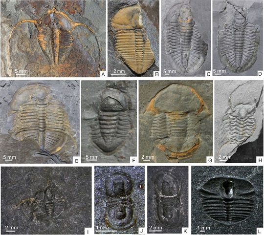A, B, L: Seleneceme sp.; C, D: Niobe sp.; E: Borogothus sp.; F: Degamella sp.; K: Geragnostus sp.; I: Ampyx sp.; G: Nileus sp.; J: Dividuagnostus sp.; H: Orometopidae Hupe, 1955